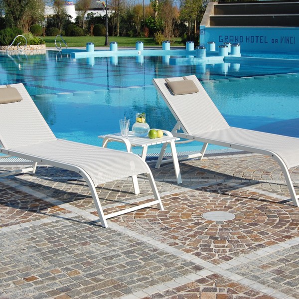Lettino reclinabile e impilabile a 4 posizioni: relax, solarium, lettura. Leggero e altamente resistente alle intemperie e ai raggi solari. Telaio completamente realizzato in alluminio con viteria inox; tela in tessuto atossico e certificata Green PVC, prodotta interamente in